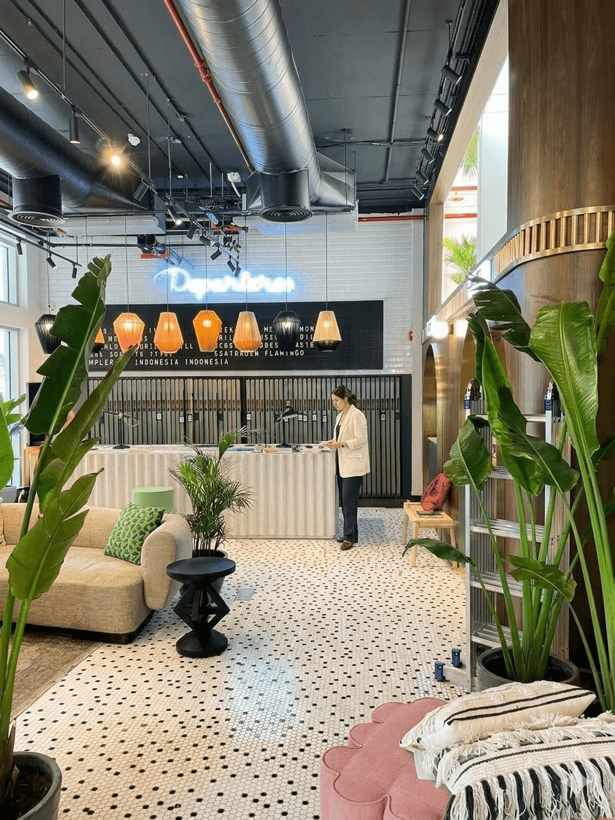 Inspired from train station and evoking a sense of voyage the interior of the store was curated with a sense of discovery. A custom designed built-in pull-out system acts as an archive of the collection, as well as the carefully curated moods developed by Inca & Co's design team. The whole atmosphere was designed to be inviting and comfortable, as as described by Binti Home the shop is "Hotel Lobby Chic".